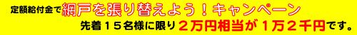 先着15名様までに、ただいま網戸張替工事代総額20,000円相当を12,000円にて御提供致します。 ぜひこの機会に網戸の張替をして、新鮮な空気をお部屋に取り入れ健康家族になりましょう。 ついでにアミドの点検もサービスにて実施いたします。 戸車は ゴムは 等々・・・・・ |