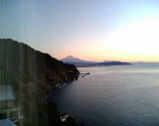 部屋から見えた朝焼けの富士山です、右の方にうっすら見える稜線は西伊豆です。