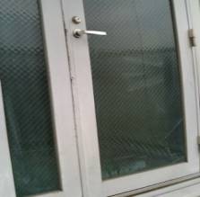 午前/午後・・営業所の事務所の入口ドアに入って入る網入りガラス修理の現調及お見積